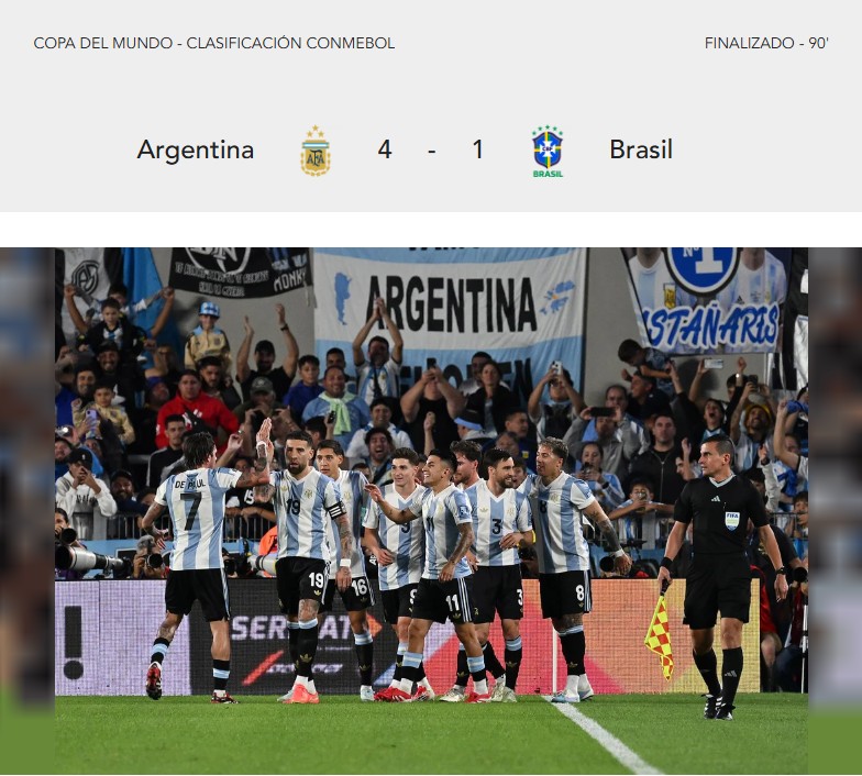 Con los goles de Julián Álvarez a los cuatro minutos, Enzo Fernández a los 12, Alexis a los 37, en el primer tiempo, y Giuliano Simeone a los 26 del segundo, el equipo argentino celebró ante su gente la clasificación al Mundial de Estados Unidos, Canadá y México 2026 y el gran desempeño de los jugadores ante Brasil, aún sin Lionel Messi en cancha.